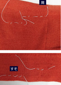 後身頃のちょうど真ん中あたりに穴あきがありました。 目立つ場所と、大変細い糸でございましたが、綺麗にお修理させて頂きました。 ※クリックしていただくと拡大画像をご覧いただけます 【Before】 【After】