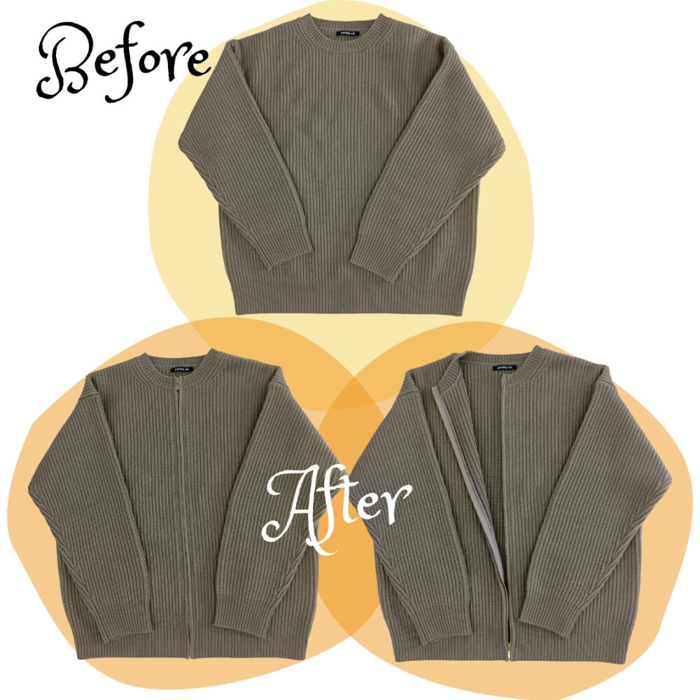 セーターを前ファスナー開きにリメイク 2026年3月27日 最終更新日時 : 2026年3月28日 ニット修理専門工房管理者 被って着る形のセーターを、前中心にファスナーを付けることによって、ファスナーを開閉させて着られるようにリメイクしました。お気に入りのお洋服をお修理させて頂く事により、これからも長く気持ちよくご愛用頂けると嬉しいですね。 FacebookX