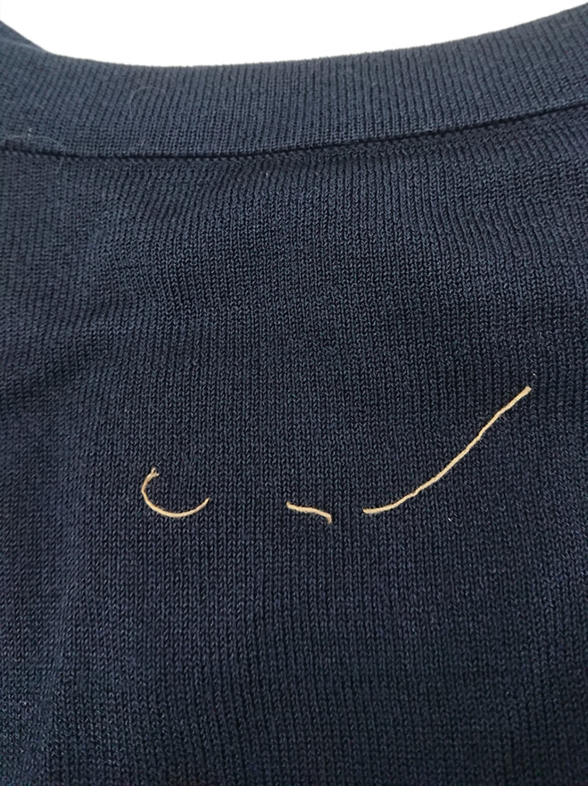 サマーニットの胸元辺りに糸引きが1箇所あり、糸が細いニットでしたが、お修理跡が残らず綺麗に穴あきのお修理が出来ました。